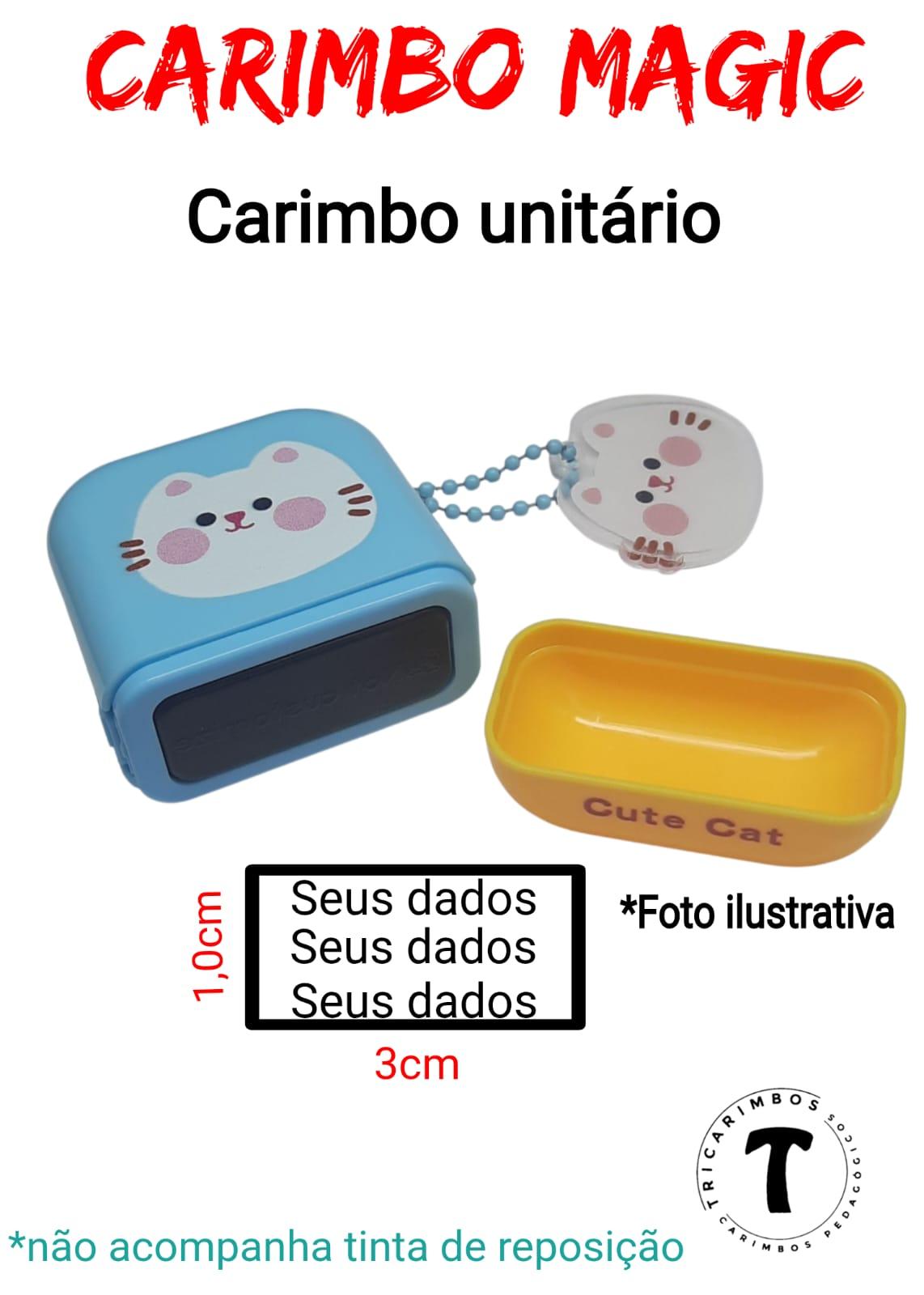 Venda por unidade. Escolha a quantidade de carimbos, selecione uma imagem e quando abrir a caixa de texto, escreva o que deseja para cada figura. Caso queira sem imagem, clique em "sem imagem" e digite seu texto. Máximo de 2 linhas com 20 caracteres em cada linha. Caso exceda, a caixa de texto será bloqueada automaticamente. P.S: CASO QUEIRA SEU NOME FAVOR ESCREVER NA CAIXA TEXTO. Os Tricarimbos não usam almofadas, são pré-entintados com tinta aromatizada (não utilize outros tipos de tinta). Adquira a tinta para aproveitar o valor do frete. PRAZO DE CONFECÇÃO DE ATÉ 10 DIAS ÚTEIS + o prazo dos Correios. As cores podem variar um pouco conforme a tela do computador ou celular.